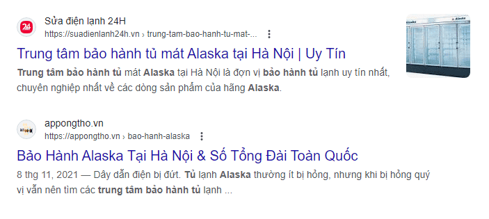 Khi tìm kiếm trên Google với dạng từ khoá: trung tâm bảo hành tủ đông Alaska, trung tâm bảo hành máy lạnh Alaska,… ta sẽ thấy nhiều website có tít liên quan đến trung tâm bảo hành Alaska như hình sau:
